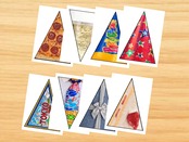 クルクル紙芝居「パーティー」の型紙データです、パーティー帽子、クラッカー、スパークリングワイン、ピザ、ケーキ、プレゼント、ネクタイ、ペナントが描かれた8枚の型紙のデータのみの販売です、印刷、製作はご自身で行ってください、作り方はこのサイトの動画をご覧ください